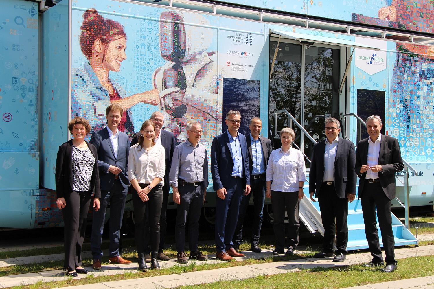 Die Mitglieder des Steuerkreises vor dem expedition-d-Truck an der Hochschule Aalen, zusammen mit SmartPro-Projektmanagerin Dr. Kristina Lakomek (1. von links).